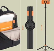De telescopische arm kan tot 152 cm worden uitgeschoven, waardoor je brede opnamen kunt maken die ideaal zijn voor het vastleggen van landschappen of grote groepen. Ingeklapt is hij slechts 25 cm lang en weegt hij slechts 300 gram, waardoor hij licht, compact en handig is om mee te nemen.