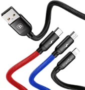 Met de hoogwaardige kabel kunt u snel en eenvoudig drie apparaten tegelijkertijd opladen - met USB C-, Lightning- en Micro-USB-aansluitingen. Elke kabel heeft een andere kleur zodat je ze gemakkelijk kunt herkennen. De kabel ondersteunt opladen tot 3,5 A (max. 2 A per kabel) en is veelzijdig dankzij de brede compatibiliteit. De aluminium bits zijn robuust en de gevlochten nylon huls is bestand tegen beschadiging en slijtage en voorkomt in de war raken van de kabel. De meegeleverde kabelbinder maakt het gemakkelijk om de kabel op te bergen en te ordenen.