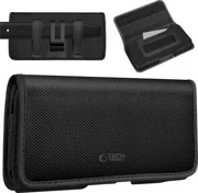 Het is gemaakt van duurzaam, slijtvast nylon en biedt uitstekende bescherming tegen beschadiging, vuil en vocht. De zachte binnenvoering beschermt het scherm en de hoes tegen krassen, terwijl de flexibele zijpanelen ervoor zorgen dat de binnenkant zich aanpast aan de dikte van de telefoon. De hoes is voorzien van een metalen clip en riemlussen waarmee de hoes comfortabel horizontaal gedragen kan worden. De sterke klittenbandsluiting voorkomt effectief dat het toestel per ongeluk opengaat en eruit valt, zodat het zelfs bij intensief bewegen veilig is.