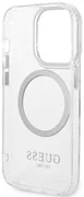 De case benadrukt perfect het unieke design van je iPhone, hij is versierd met zilveren elementen zoals het frame rond de lenzen, de knoppen en het Guess logo. De case is uitgerust met een magnetische ring die compatibel is met de MagSafe draadloze oplader, zodat je hem snel en gemakkelijk kunt opladen. De magnetische ring past perfect bij de kleuren van de hoes.