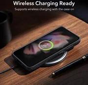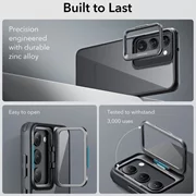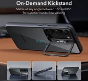 Naast de standaard verhoogde afdekking rond de lenzen, is de behuizing bovendien uitgerust met een metalen openingsframe dat gemakkelijk kan worden omgezet in een functionele standaard. Het heeft knoopdeksels en uitsparingen voor poorten.De hoes is perfect geschikt en beperkt de mogelijkheid van draadloos opladen niet.