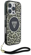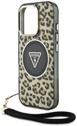 Exclusief geval van de gerenommeerdeMerk Guess combineert elegantie en stijl op het hoogste niveau. De kast is gemaakt vanpolycarbonaat en polyurethaan. Het oppervlak is versierd met eendierenprintdie op vlekken lijken, samen met een goudenMagSafe ring.