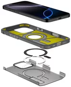 De tweedelige constructie is gemaakt van slijtvast thermoplastic en een verstevigend frame van polycarbonaat. De binnenkant van de hoes is gevuld met technologisch schuim, dat een extra laag bescherming biedt tegen stoten of vallen van het apparaat.
